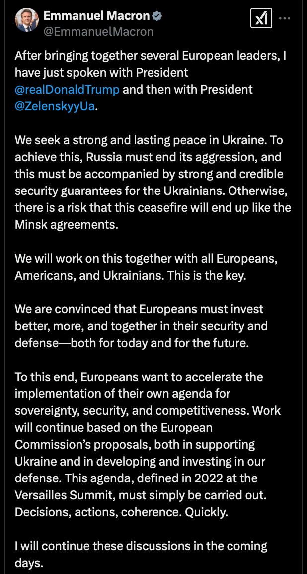 "Работа будет продолжена на основе предложений Европейской комиссии, как по поддержке Украины, так и по развитию и инвестированию в нашу оборону. Эту повестку дня, определенную в 2022 году на Версальском саммите, нужно просто реализовать", - написал Макрон.