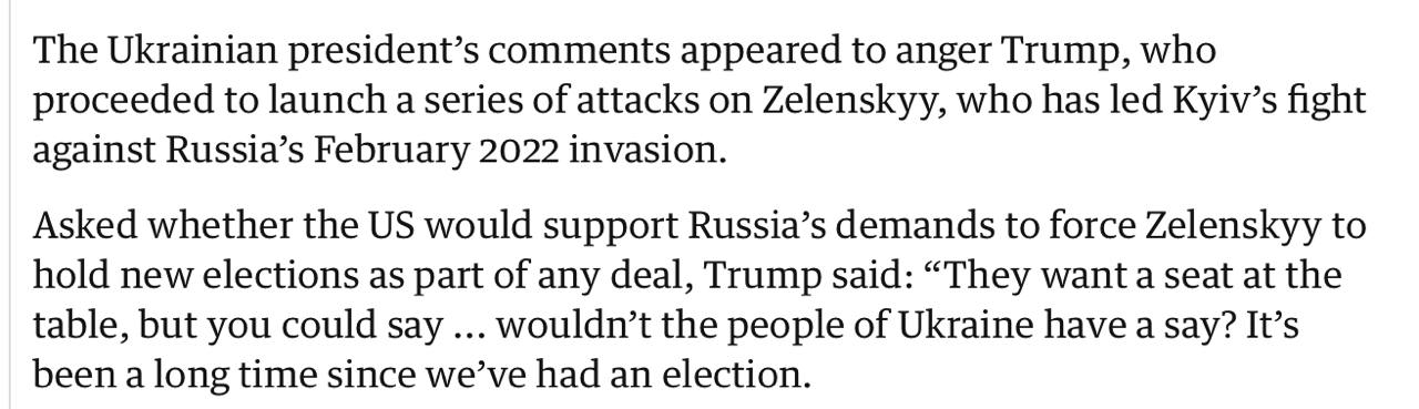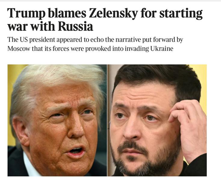 Напомним, американский президент заявил, что Киев сам виноват в начале войны, упрекнул Зеленского в нежелании вести переговоры и призвал его провести выборы, заявляя, что у него низкий рейтинг в районе 4%. И что Зеленский, по мнению Трампа, с таким рейтингом не может представлять Украину за столом переговоров.