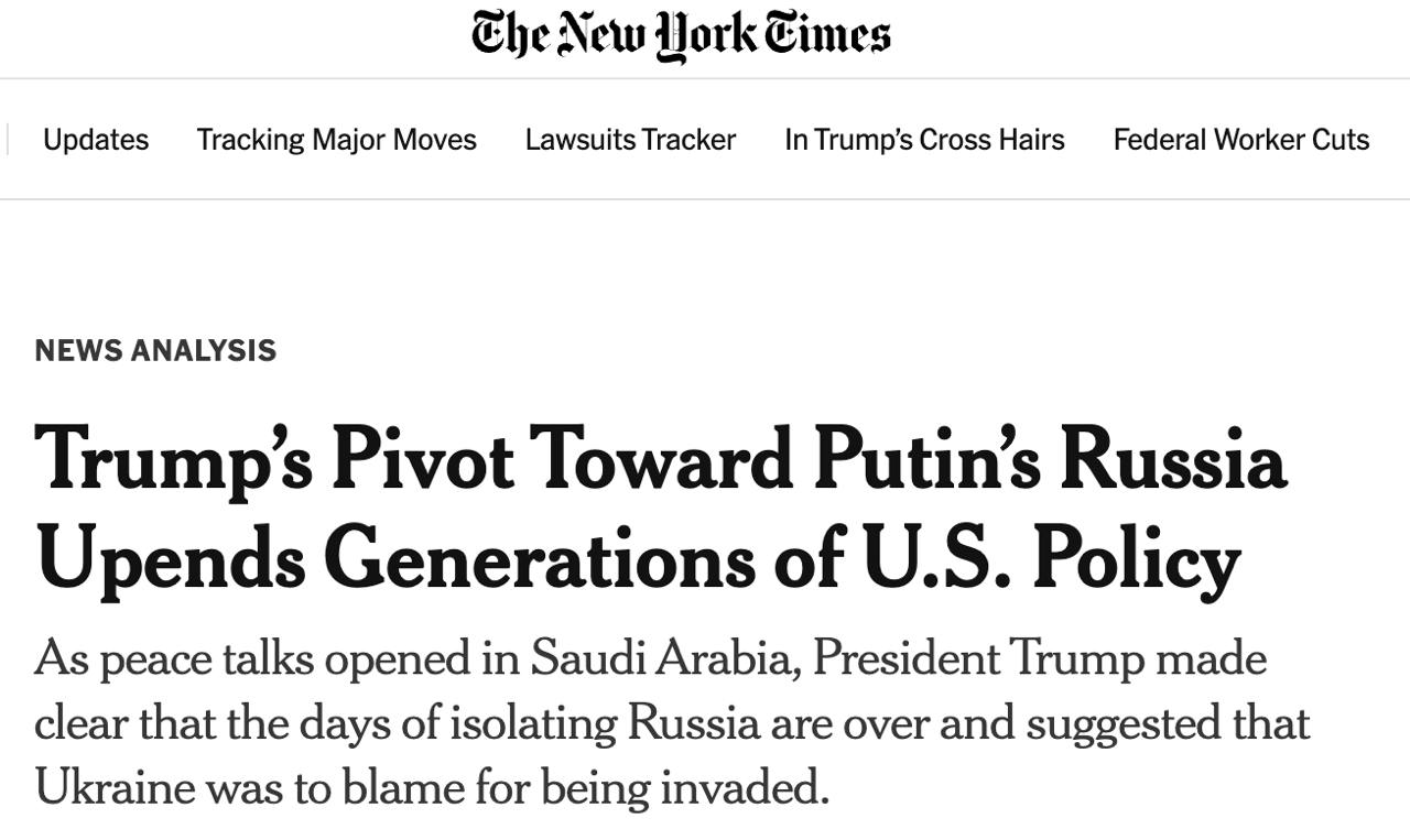 "Трамп находится в процессе осуществления одного из самых ошеломляющих поворотов в американской внешней политике за последние поколения, поворота на 180 градусов, который заставит друзей и врагов пересмотреть свои взгляды в фундаментальных отношениях. С момента окончания Второй мировой войны длинный парад американских президентов сначала рассматривал Советский Союз, а затем, после краткого и иллюзорного междуцарствия, его преемницу Россию как силу, которой следует, по крайней мере, опасаться. Трамп делает все возможное, чтобы рассматривать ее как соучастника в будущих совместных предприятиях", - написала NYT.