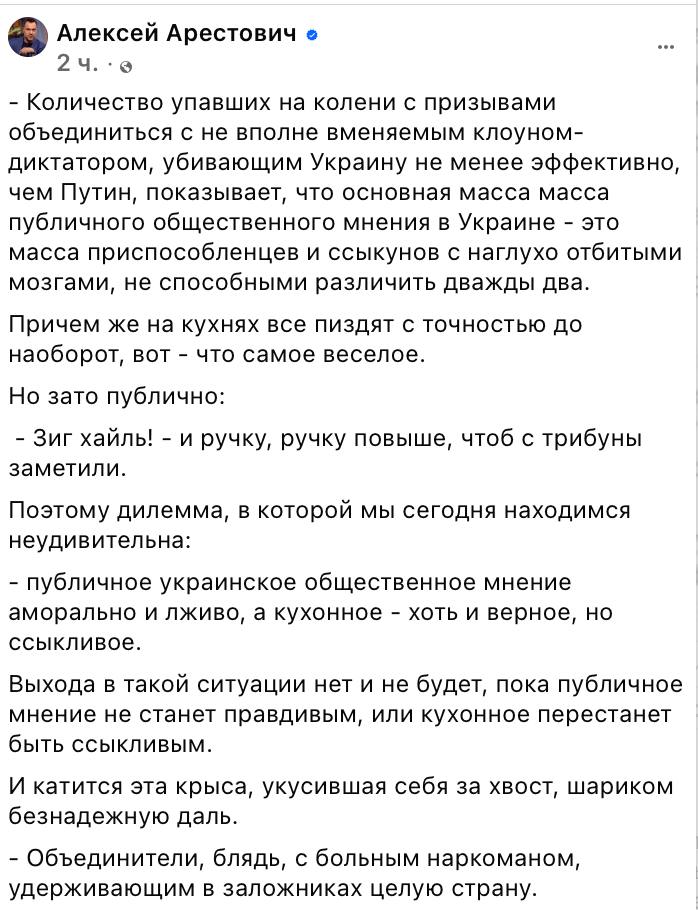 Арестович заявил, что призывы блогеров, подконтрольных Офису президента, объединяться вокруг Зеленского выглядят "аморально и лживо", поскольку Зеленский "убивает Украину не менее эффективно, чем Путин".
