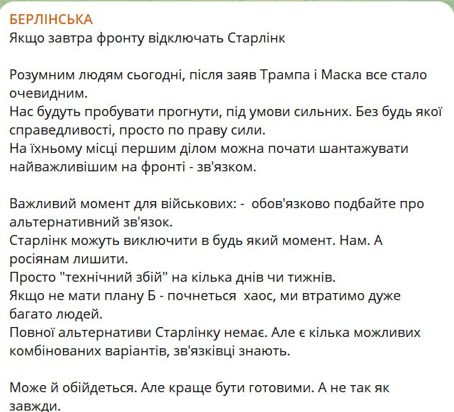 "Старлинки могут выключить в любой момент. Нам. А россиянам оставить. Просто "технический сбой" на несколько дней или недель. Если не иметь плана Б – начнется хаос, мы потеряем очень много людей. Полной альтернативы Старлинку нет. Но есть несколько возможных комбинированных вариантов, связные знают", – написала Берлинская.