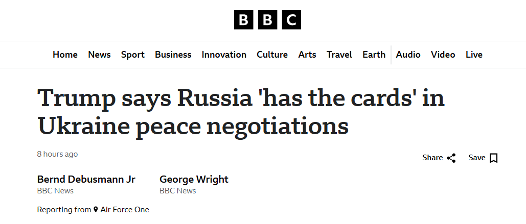Президент США Дональд Трамп заявил, что у России есть "козыри" в переговорах. По его словам, РФ имеет преимущество из-за того, что она "захватила много территории".