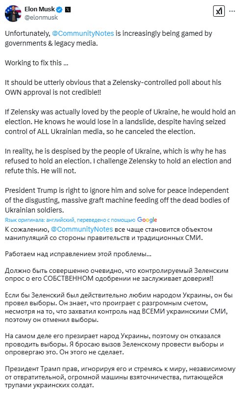 "Президент Трамп прав, игнорируя его (Зеленского - Ред.) и стремясь к миру, независимому от отвратительной, огромной машины взяточничества, питающейся трупами украинских солдат", - заявил Маск.