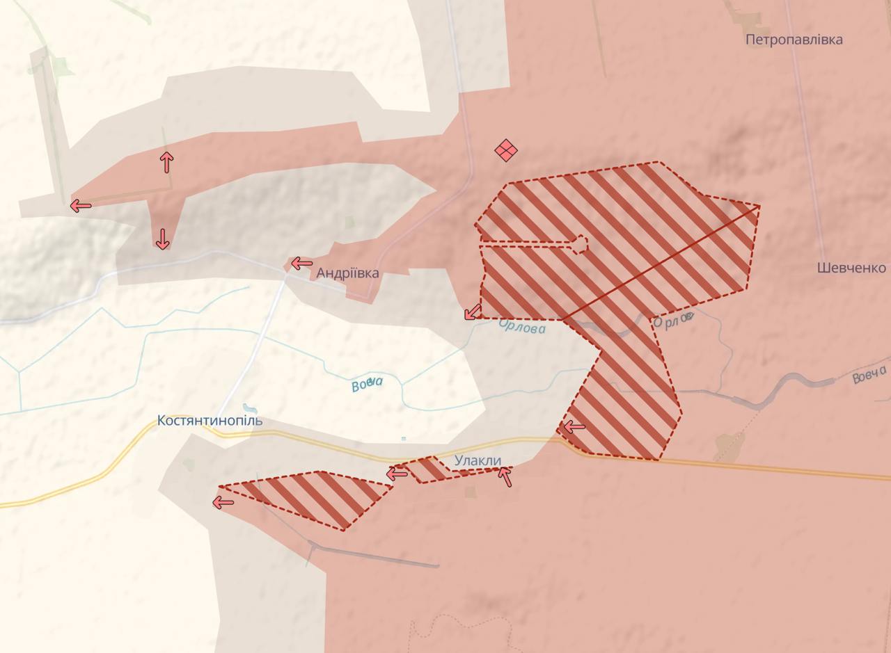 Армия РФ продолжает активно продвигаться под Андреевкой на запад от Курахово, свидетельствует карта Deep State. В Константинополе бои уже подошли к трассе на Запорожье.