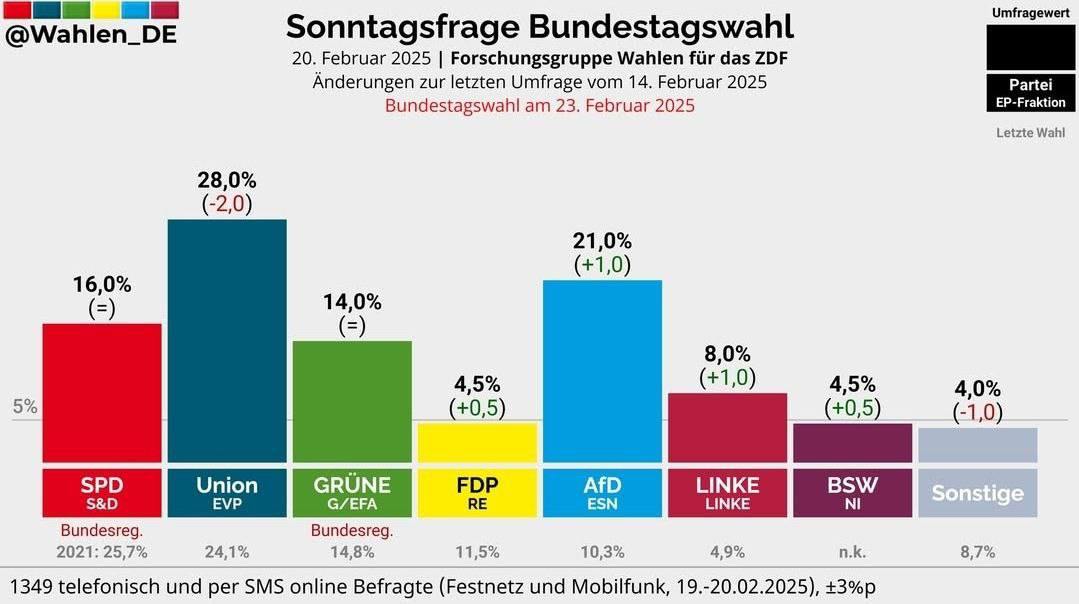 Лидировать по опросам продолжает союз ХДС/ХСС - хотя он и потерял 2% и сейчас имеет 28%.