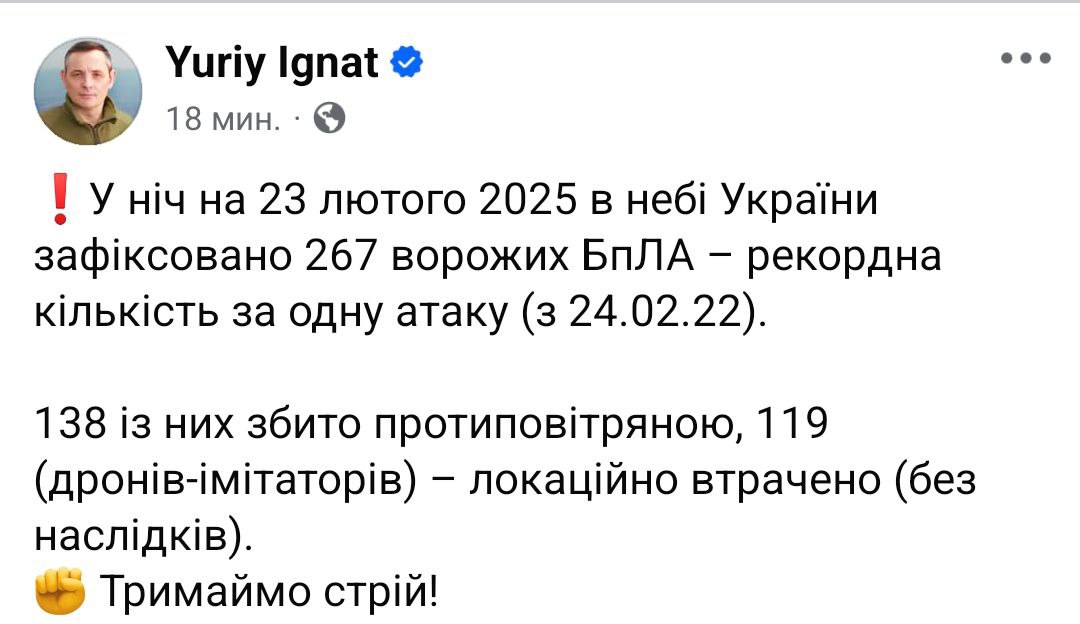 Ночью Украину атаковали сразу 267 беспилотников разных типов. 138 из них сбили, а 119 "локационно утрачены".