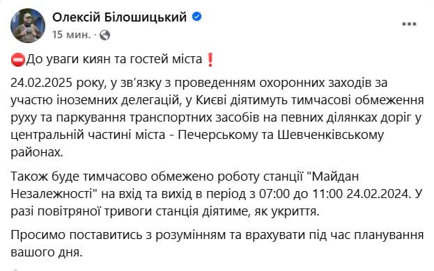 Первый заместитель начальника Департамента патрульной полиции Алексей Белошицкий уточнил, что временные ограничения будут действовать в связи с приездом в Киев иностранных делегаций на третью годовщину полномасштабного вторжения РФ.