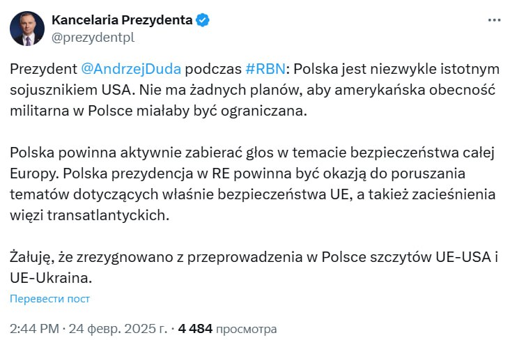 Об этом заявил президент Польши Анджей Дуда, сообщает в соцсети Х его канцелярия.