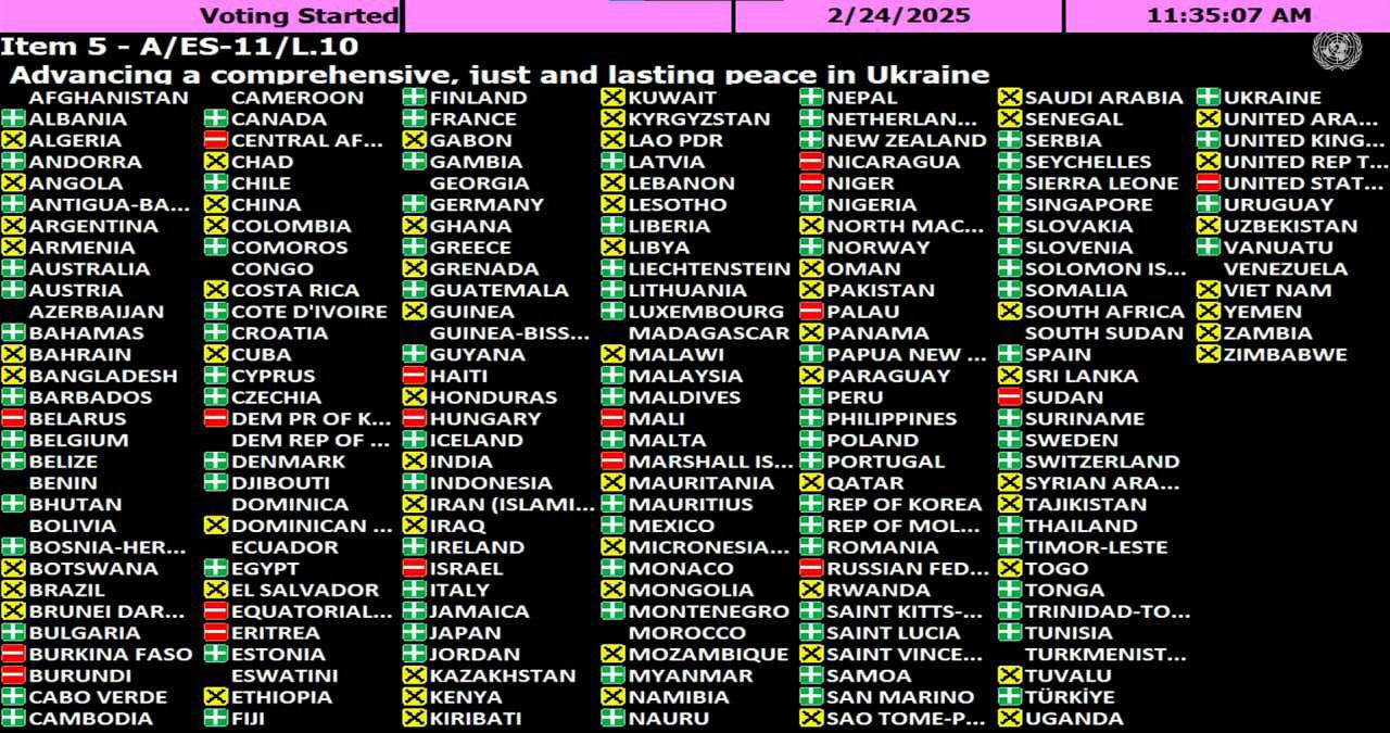 Вашингтон отказался быть соавтором этого проекта и предложил свой, нейтральный. Как сообщали медиа, в нем "действия Украины приравниваются к действиям России". Также в ней говорится о трагической утрате "жизней в российско-украинском конфликте" и содержится призыв скорее прекратить конфликт и установить прочный мир между Украиной и Россией. Между прочим, Москва внесла поправку к американскому проекту резолюции с призывом "устранения коренных причин" кризиса. Госсекретарь США Марко Рубио называл соответствующий проект историческим.