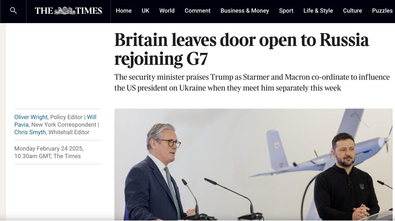 По данным издания, британский министр безопасности Дэн Джарвис не стал исключать вероятности возвращения РФ в G7.