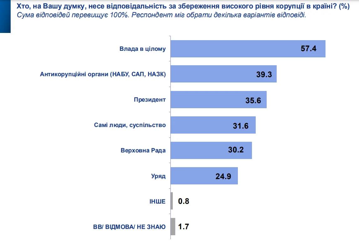 Если брать отдельные государственные институты, то наибольшая ответственность за высокий уровень коррупции, по мнению опрошенных, лежит на антикоррупционных органах в лице НАБУ и САП (39,3%), а также на президенте (35,6%).