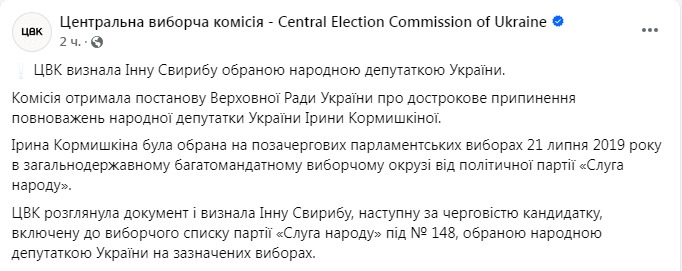 Центральная избирательная комиссия признала Инну Свирибу избранным народным депутатом Украины, получив постановление Верховной Рады о досрочном прекращении полномочий народного депутата Ирины Кормышкиной (также известна под фамилией Аллахвердиева).