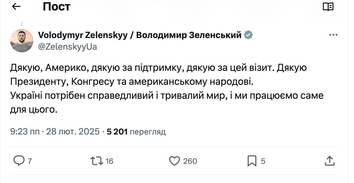 "Спасибо, Америка, спасибо за поддержку, спасибо за этот визит. Спасибо Президенту, Конгрессу и американскому народу. Украине нужен справедливый и длительный мир, и мы работаем именно для этого", - написал Зеленский.