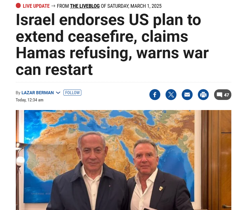 После окончания 42 дней первой фазы прекращения огня в секторе Газа Израиль поддержал предложение США о продлении прекращения огня с ХАМАС на Рамадан и Песах.