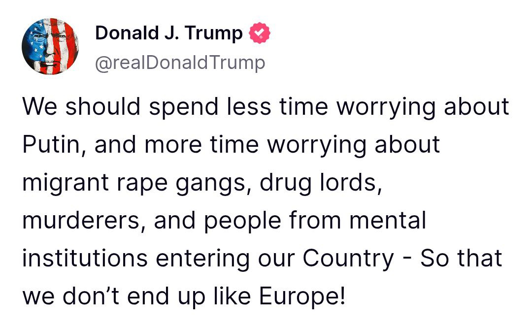 "Нам следует меньше волноваться о Путине и больше беспокоиться о бандах насильников-мигрантов, наркобаронах, убийцах и людях из психиатрических лечебниц, въезжающих в нашу страну, - чтобы мы не закончили как Европа!" - написал президент США в своей соцсети Truth Social.