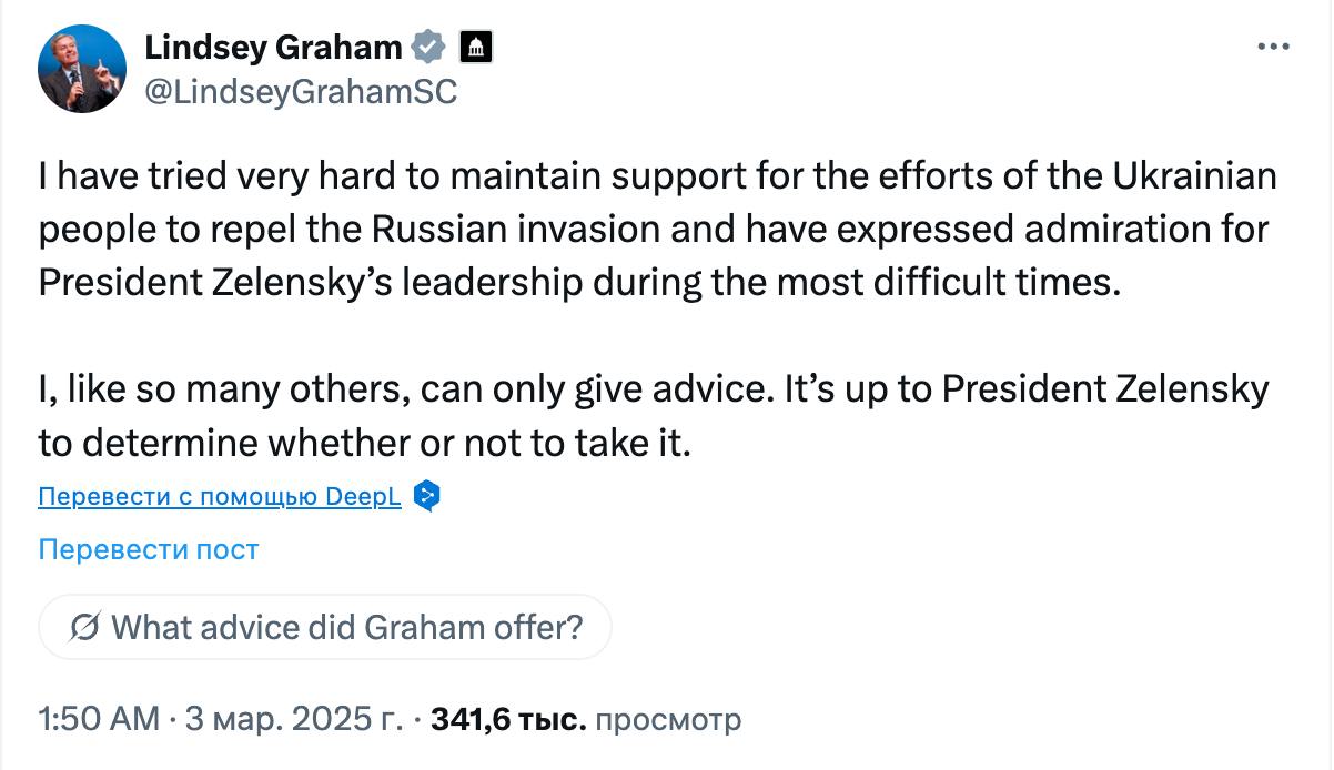 Также Грэм добавил, что Зеленский сам должен решить, принимать его советы или нет.