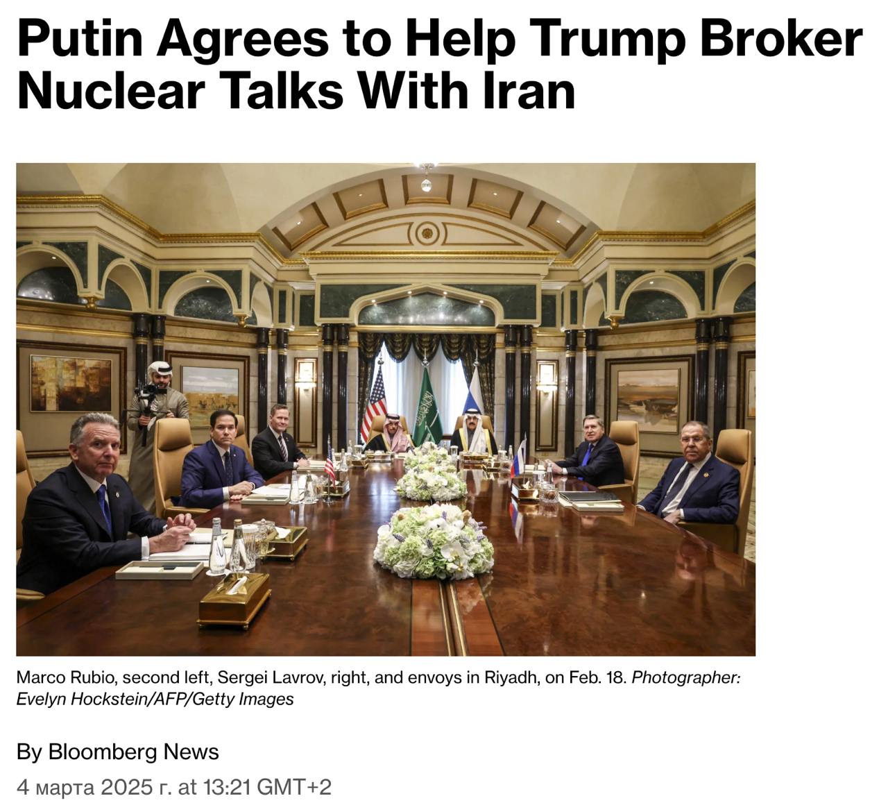 "Вопрос обсуждался на встрече главы МИД РФ Сергея Лаврова и госсекретаря США Марко Рубио в Эр-Рияде через несколько дней", - пишет издание.