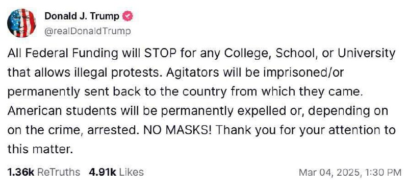 "Все федеральное финансирование прекратится для любого колледжа, школы или университета, которые допускают незаконные протесты. Агитаторы будут заключены в тюрьму или навсегда отправлены обратно в страну, из которой они приехали. Американские студенты будут навсегда исключены или, в зависимости от преступления, арестованы. Никаких масок!" - написал Трамп в своей соцсети.
