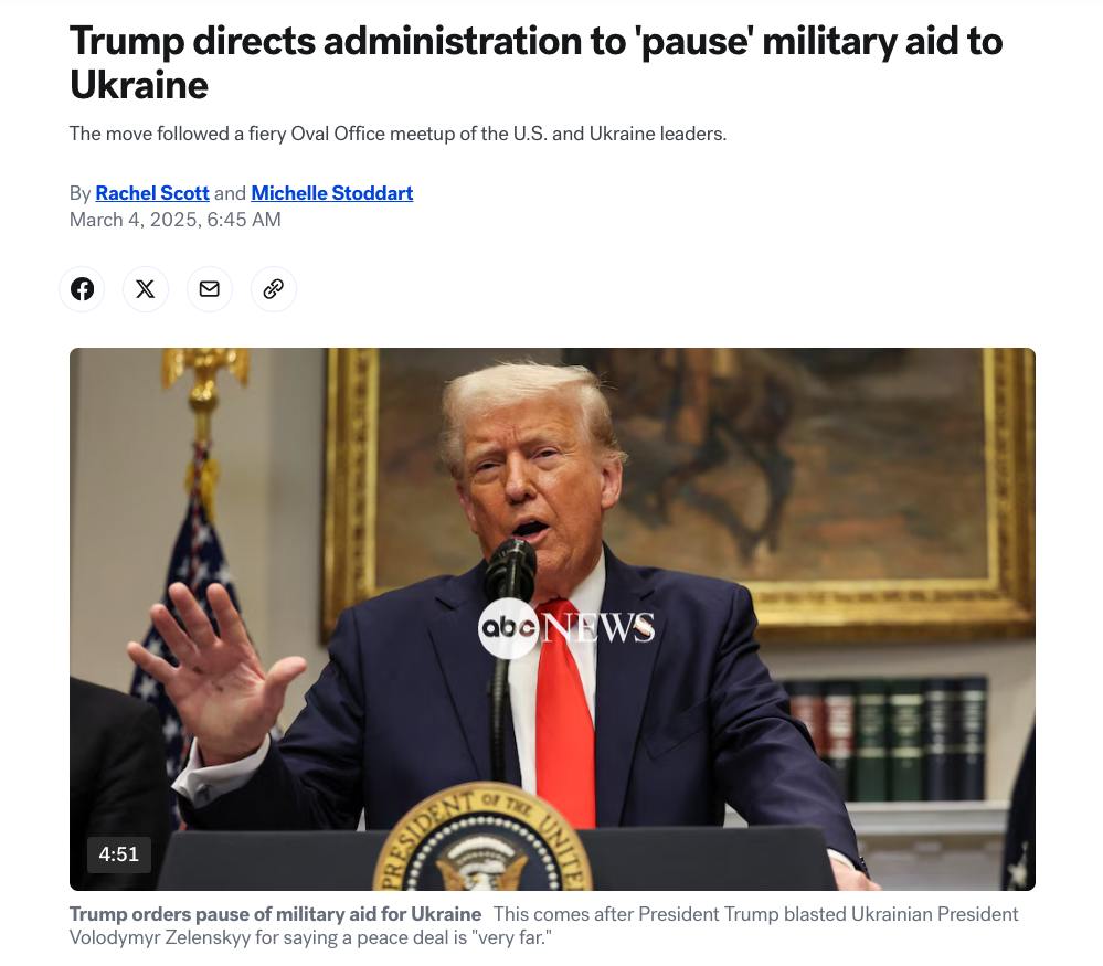 Напомним, что США остановили военную помощь Украине. Американские издания писали, что речь идет в том числе и об оружии, которое уже отправлено и находится в дороге. До Украины оно не дойдёт.