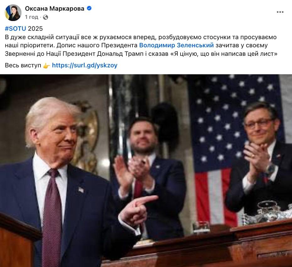 "Сообщение (допис) нашего президента зачитал в своем обращении к нации президент Дональд Трамп и сказал: "Я ценю, что он написал это письмо", - написала Маркарова.