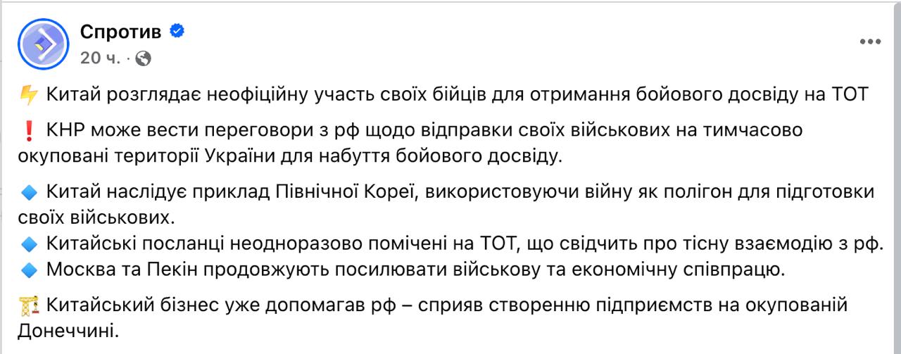"Китай рассматривает неофициальное участие своих бойцов для получения боевого опыта на ВОТ (временно оккупированных территориях - Ред.). КНР может вести переговоры с РФ об отправке своих военных на временно оккупированные территории Украины для приобретения боевого опыта", - заявляет ЦНС.