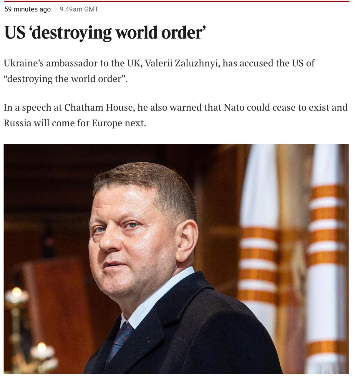 Бывший главнокомандующий Вооруженными силами Украины и посол в Великобритании Валерий Залужный заявил, что США "разрушают мировой порядок".