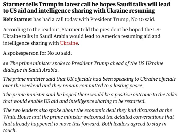 Премьер-министр Британии заявил, что "надеется на положительный результат переговоров, который позволит возобновить американскую помощь и обмен разведданными".