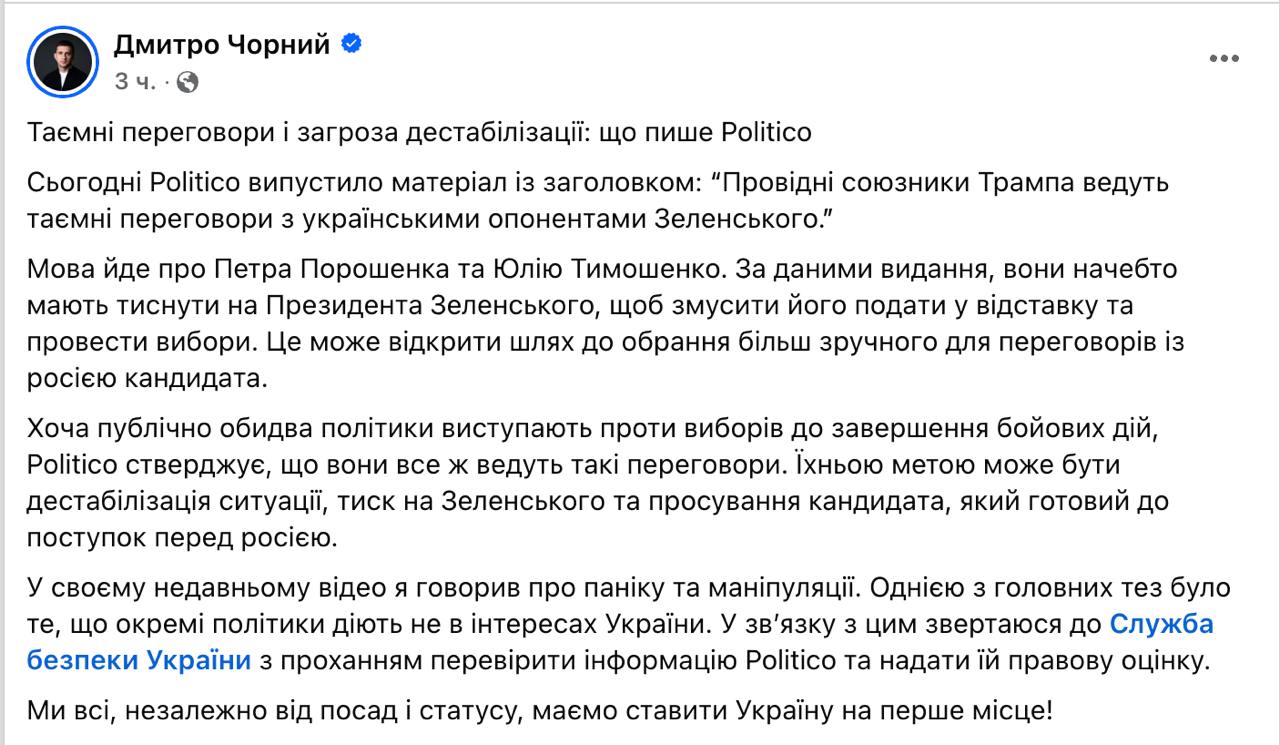 "В связи с этим обращаюсь к Службе безопасности Украины с просьбой проверить информацию Politico и дать ей правовую оценку", - заявил Черный.