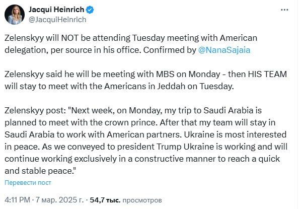 "Зеленский не будет присутствовать на встрече с американской делегацией во вторник, согласно источнику в его офисе. Зеленский сказал, что встретится с Мухаммедом ибн Салманом в понедельник, а затем его команда останется, чтобы встретиться с американцами в Джидде во вторник", - сказано в ее публикации.