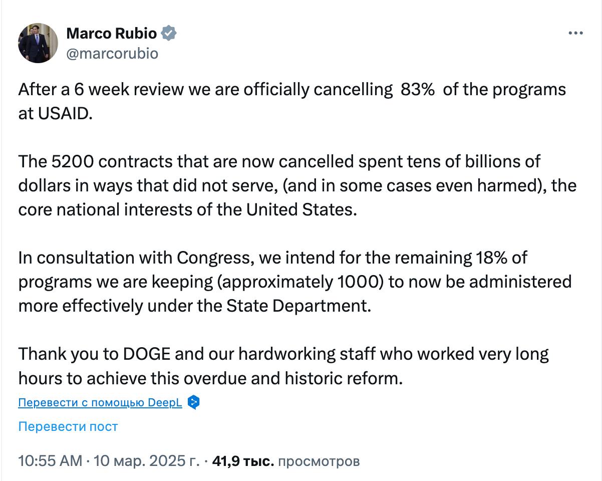 "После шестинедельного аудита мы официально отменяем 83% программ USAID. 5200 контрактов, которые сейчас отменены, потратили десятки миллиардов долларов способами, которые не служили (а в некоторых случаях даже вредили) основным национальным интересам Соединенных Штатов. По согласованию с Конгрессом мы намерены, чтобы оставшиеся 18% программ, которые мы сохраняем (примерно 1000), теперь более эффективно администрировались Государственным департаментом", - сказано в публикации.