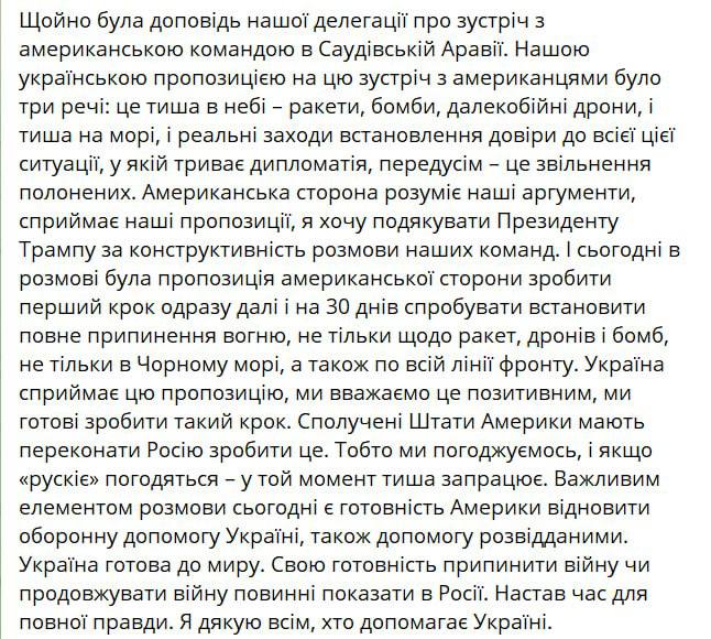 "Нашим украинским предложением на эту встречу с американцами было три вещи: это тишина в небе – ракеты, бомбы, дальнобойные дроны, и тишина на море... Сегодня в разговоре было предложение американской стороны сделать первый шаг сразу дальше и на 30 дней попытаться установить полное прекращение огня, не только ракет, дронов и бомб, не только в Черном море, а также по всей линии фронта. Украина приняла это предложение, мы считаем это положительным, мы готовы сделать такой шаг. Соединенные Штаты должны убедить Россию сделать это. То есть мы соглашаемся, и если россияне согласятся – в тот момент тишина заработает", - сказал президент.