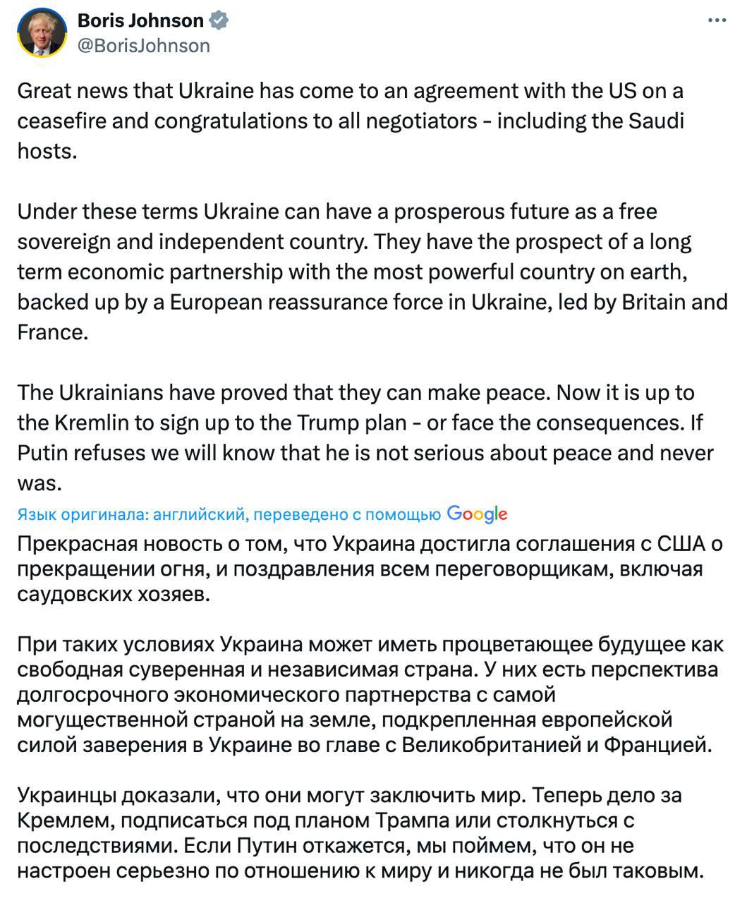"Украинцы доказали, что они могут заключить мир. Теперь дело за Кремлем, подписаться под планом Трампа или столкнуться с последствиями. Если Путин откажется, мы поймем, что он не настроен серьезно по отношению к миру и никогда не был таковым", - заявил Джонсон.