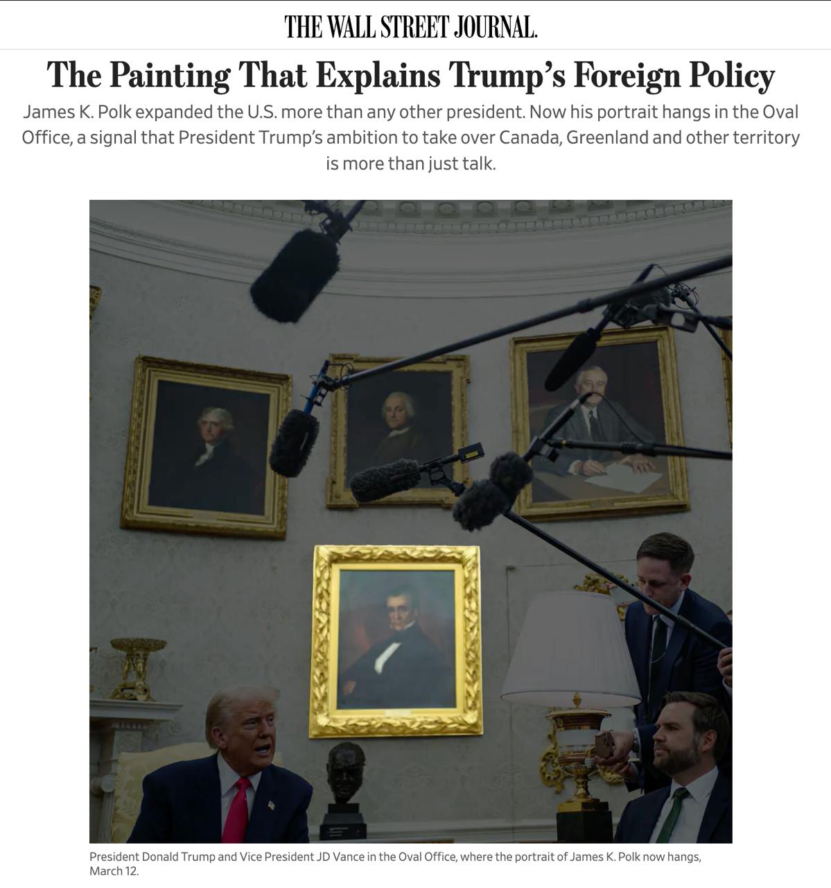 Издание отмечает, что после возвращения в Белый дом он повесил в Овальном кабинете портерт Джеймса Полка - 11-го президента США, которым восхищается из-за "получения большого количества земель". Полк за четыре года почти удвоил территорию США, аннексировал Техас, а также вынудил Мексику продать Калифорнию, Аризону, Нью-Мексико, Неваду, Юту и части Колорадо и Вайоминга.