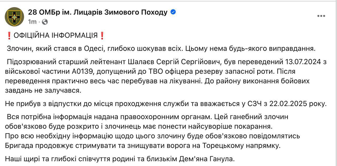 28 бригада ВСУ имени Рыцарей зимнего похода подтвердила, что подозреваемый в убийстве активиста Ганула старший лейтенант Сергей Шалаев действительно служил в этом подразделении.