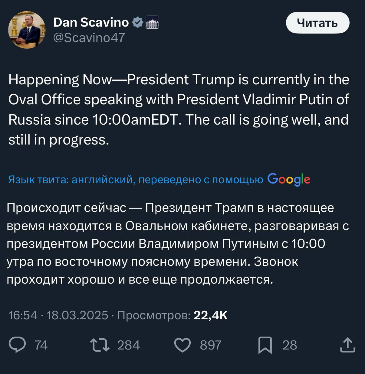 17:39 Разговор Трампа и Путина еще продолжается, написал замглавы аппарата Белого дома Дэн Скавино.