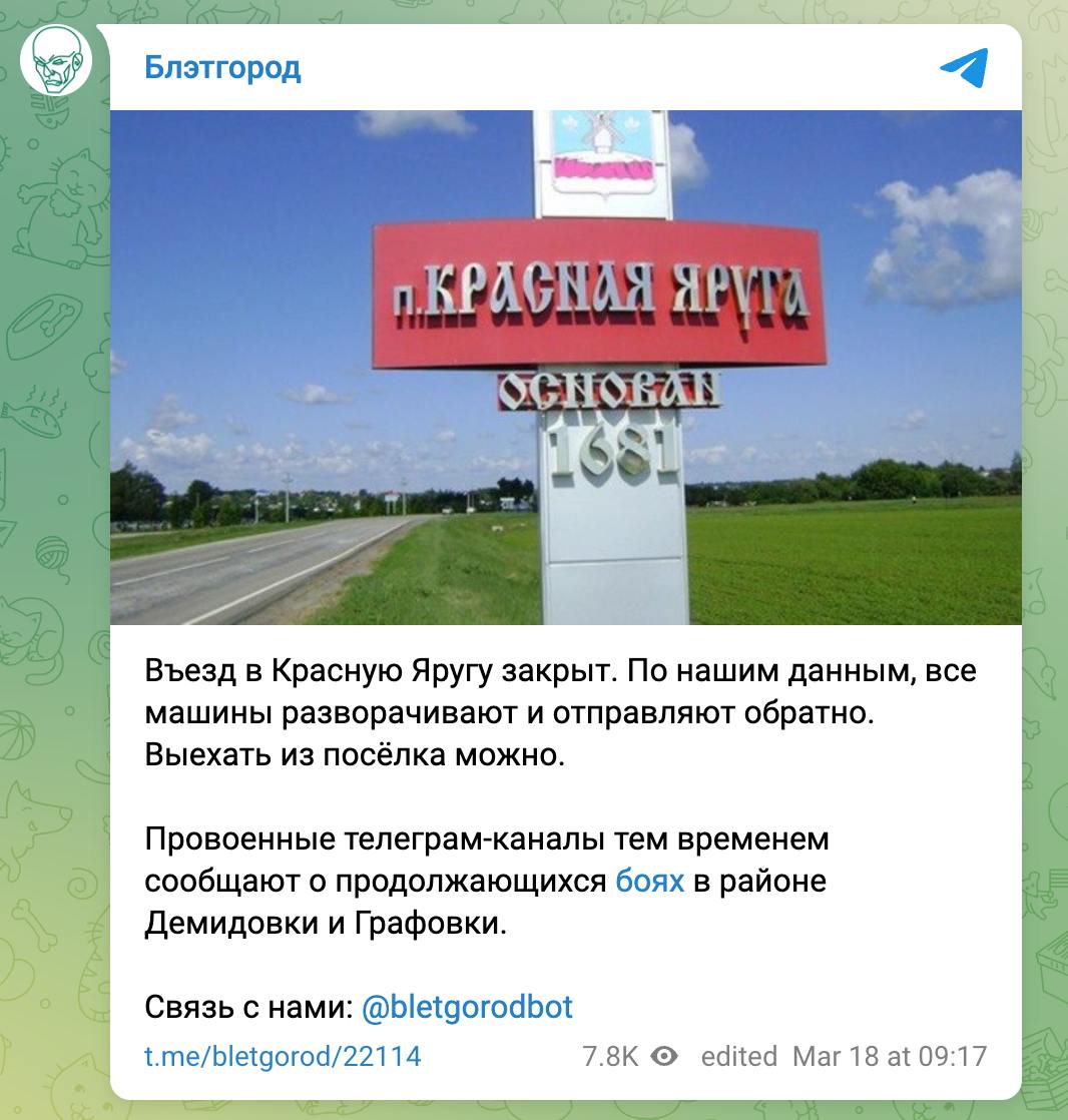 09:31 В Белгородской области РФ, где идут сообщения о попытке наступления ВСУ, закрыли въезд в Красную Яругу, сообщают местные паблики.