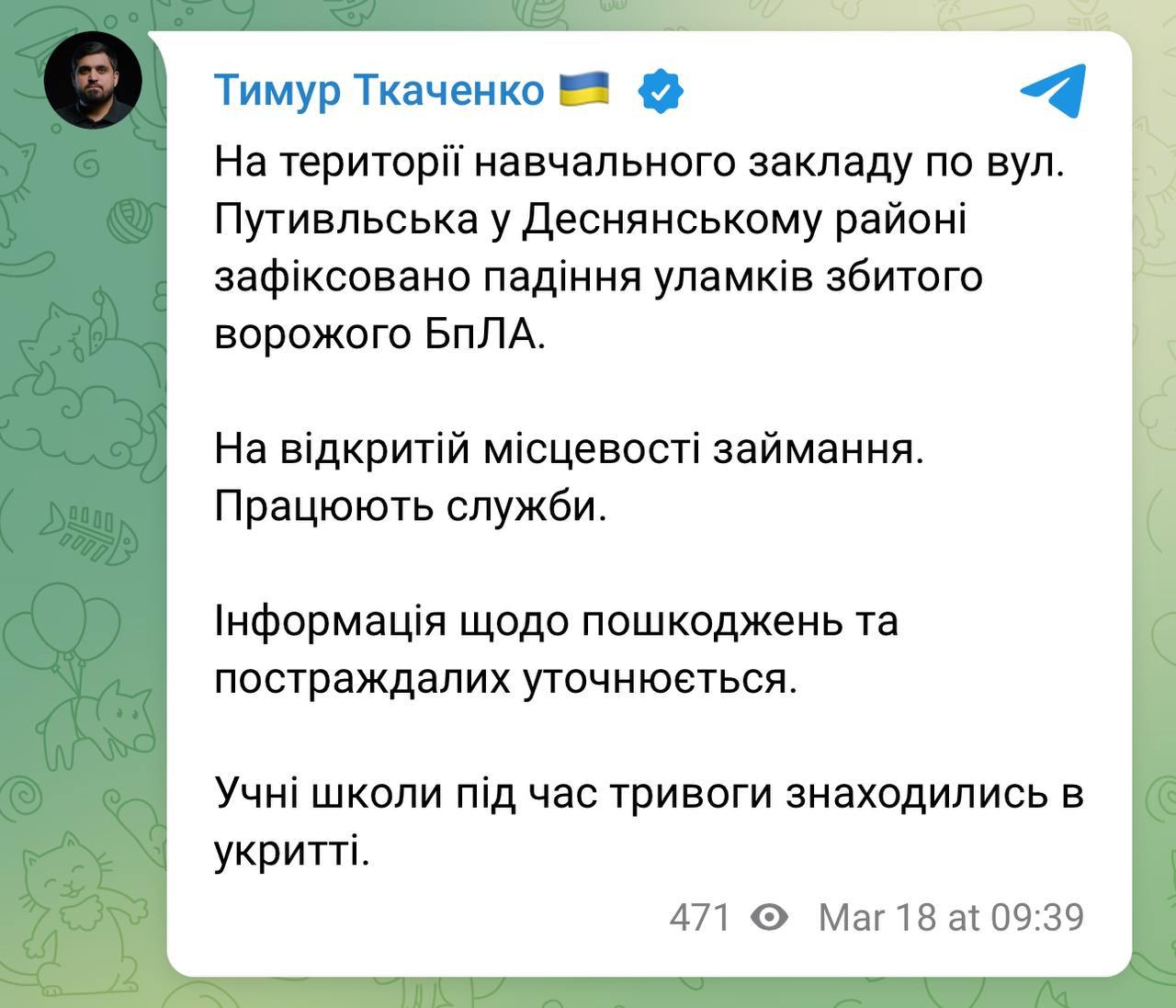 09:47 Все ученики киевской школы, на территории которой упали обломки дрона, находились в укрытии, сообщает глава КГВА Тимур Ткаченко.