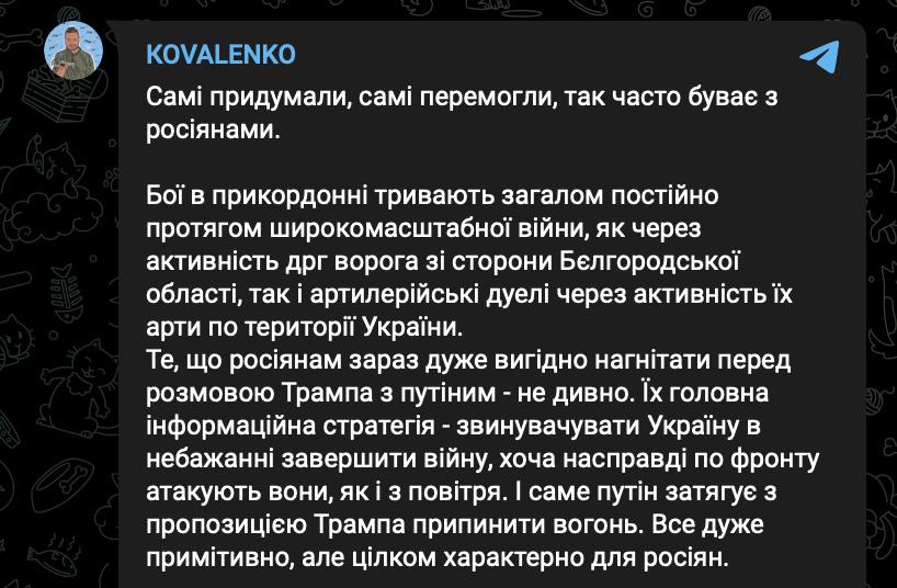 "Сами придумали, сами победили. Бои в пограничных продолжаются в целом постоянно в течение широкомасштабной войны, как из-за активности других врагов со стороны Белгородской области, так и артиллерийские дуэли из-за активности их арты по территории Украины", - написал глава "Центра по борьбе с дезинформацией" Коваленко.