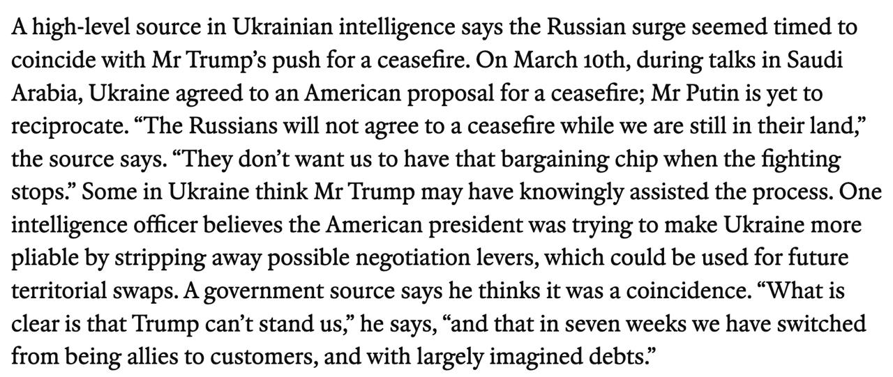 Источник уверен, что это не просто совпадение. По его мнению, россияне бы не пошли на прекращение огня, которое продвигает Трамп, без возврата своих территорий на Курщине. И что "американский президент пытался сделать Украину более сговорчивой, лишив ее возможных рычагов для переговоров, которые могли бы быть использованы для будущих территориальных обменов".