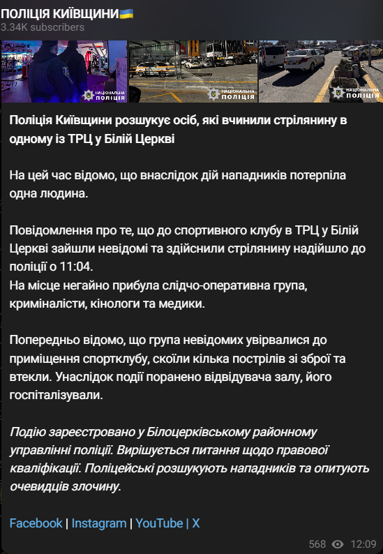 Сообщения о том, что в спортивный клуб в ТРЦ в Белой Церкви зашли неизвестные и осуществили стрельбу, поступило в полицию в 11:04.