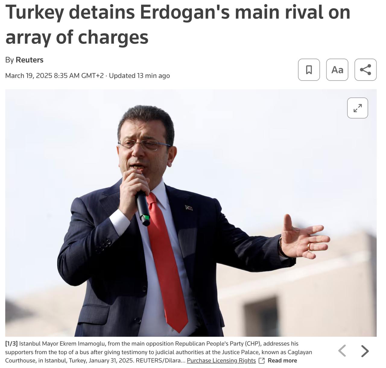 В Турции задержали мэра Стамбула Экрема Имамоглу, который является главным политическим оппонентом президента Реджепа Тайипа Эрдогана.