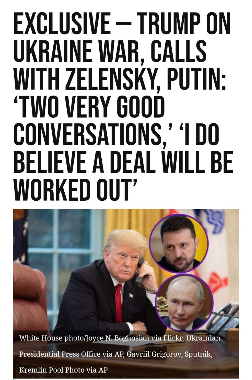 "Вчера была встреча с президентом Путиным - она прошла очень хорошо. Затем я сегодня говорил с президентом Зеленским и объяснил, что произошло вчера, и моя цель - объединить эти две страны. Затем мы договоримся о прекращении огня и в конечном итоге прекратим терять 2000 человек в неделю. В этой войне гибнут две тысячи человек в неделю или больше, и я хочу это остановить. Я также хочу прекратить огромные выплаты, которые нам необходимо сделать. Я также хочу, чтобы Европа заплатила столько же, сколько и мы, потому что они не смогли сделать этого при Байдене, а Байден никогда не просил об этом, потому что Байден был крайне некомпетентным президентом. У нас было два очень хороших телефонных звонка, и я верю, что будет достигнута сделка, и мы сможем остановить кровопролитие, которое там происходит", - сказал президент США.