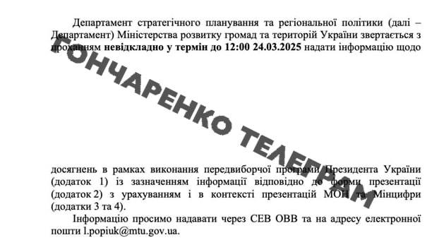 "Департамент стратегического планирования и региональной политики Министерства развития общин и территорий Украины обращается с просьбой срочно, в срок до 12:00 24.03.2025 предоставить информацию о достижениях в рамках выполнения предвыборной программы президента Украины с упоминанием информации в соответствии с формой презентации и с учетом и в контексте презентаций Мнистерства образования и науки и Минцифры", - сказано в опубликованном документе.
