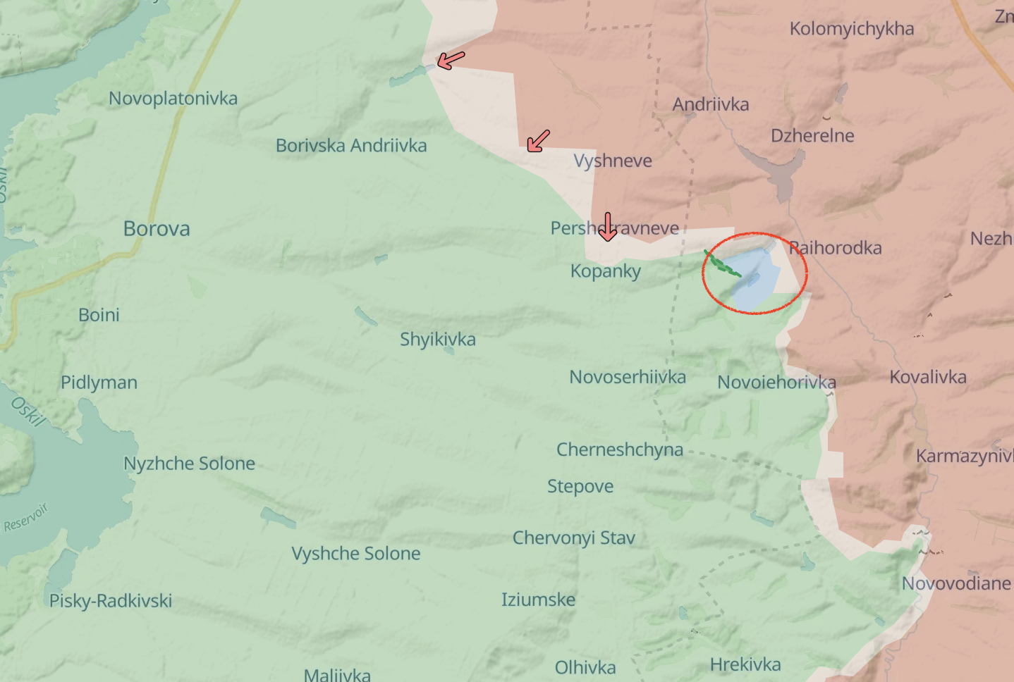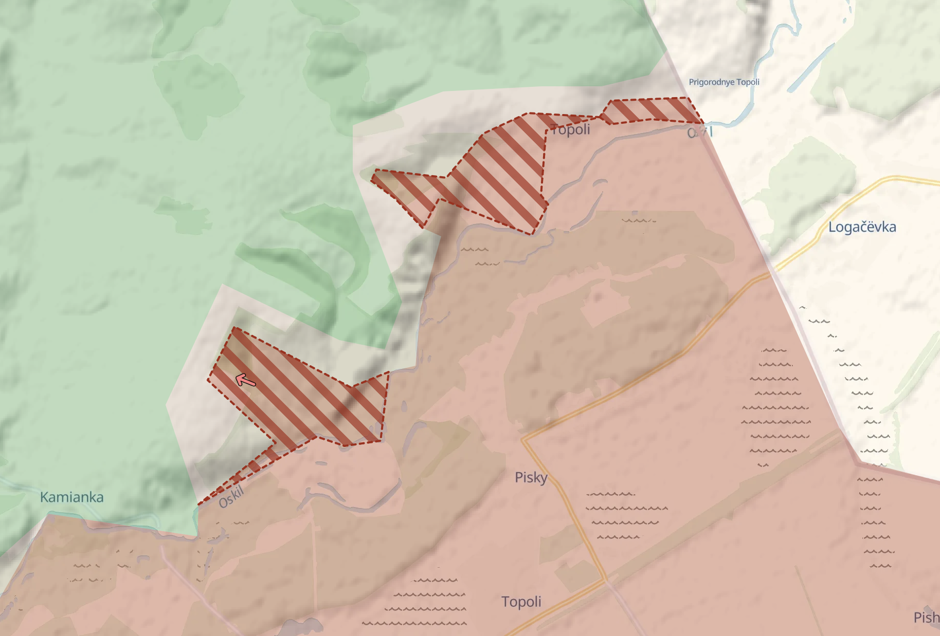 По данным DeepState, армия РФ продвинулась около Каменки и Тополей на западном берегу Оскола к северу от Купянска. Это вблизи российской границы.