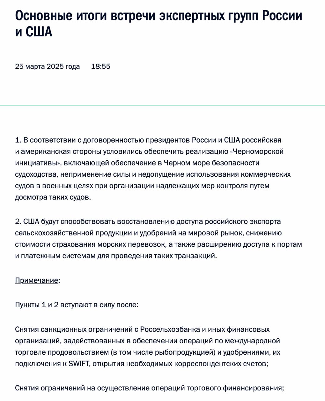 "В соответствии с переговорами на президентском уровне между президентом Дональдом Трампом и президентом Владимиром Путиным Соединённые Штаты организовали двусторонние технические переговоры с российской делегацией 23–25 марта в Эр-Рияде, Саудовская Аравия. По итогам обсуждений: