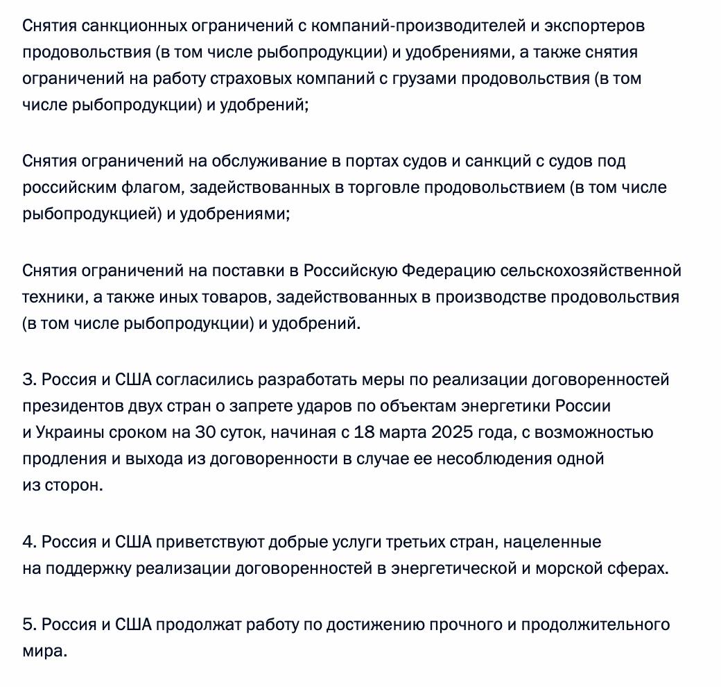 3. Россия и США согласились разработать меры по реализации договоренностей президентов двух стран о запрете ударов по объектам энергетики России и Украины сроком на 30 суток, начиная с 18 марта 2025 года, с возможностью продления и выхода из договоренности в случае ее несоблюдения одной из сторон.