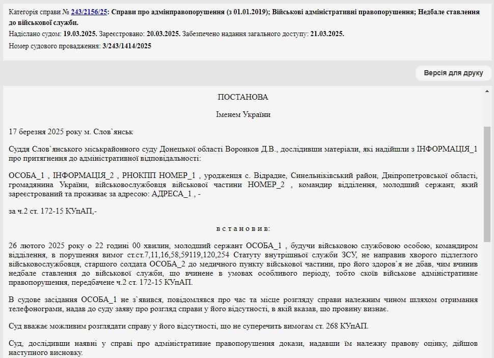 Славянский горрайонный суд Донецкой области оштрафовал на 17 тысяч гривен командира инженерно-саперного отделения одного из механизированных батальонов, младшего сержанта Андрея К. Его признали виновным в небрежном отношении к военной службе, которое привело к смерти его подчиненного.