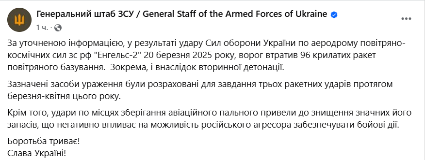 По уточненной информации, в результате удара Сил обороны Украины по российскому аэродрому "Энгельс-2" в Саратовской области, враг потерял 96 крылатых ракет воздушного базирования. В частности, и в результате вторичной детонации.