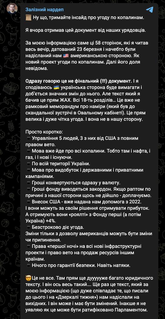 Как пишет нардеп, предложенное США соглашение о недрах "не в нашу пользу". Он заявляет, что в нем идет речь обо всех полезных ископаемых, причем как о новых, так и об уже разрабатываемых месторождениях.