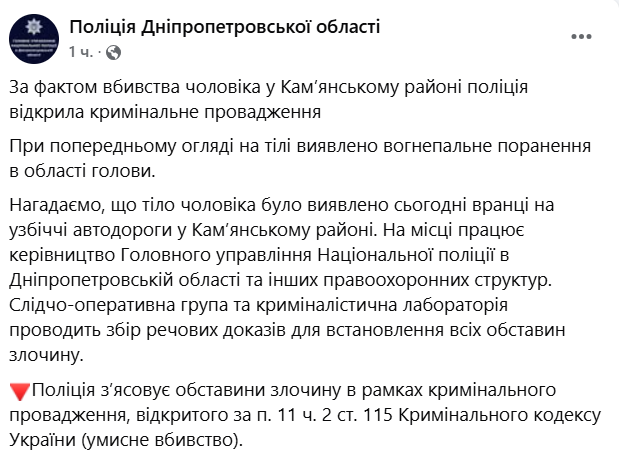В Каменском районе Днепропетровской области сегодня утром на обочине нашли труп мужчины. На теле обнаружено огнестрельное ранение в области головы.